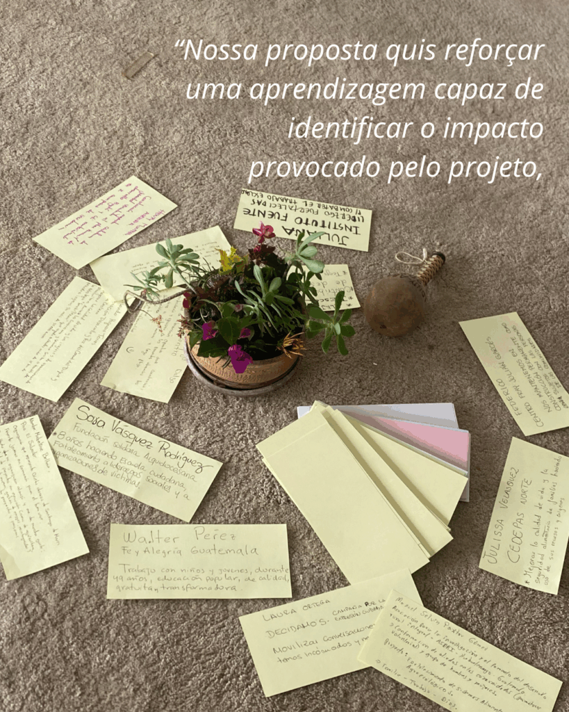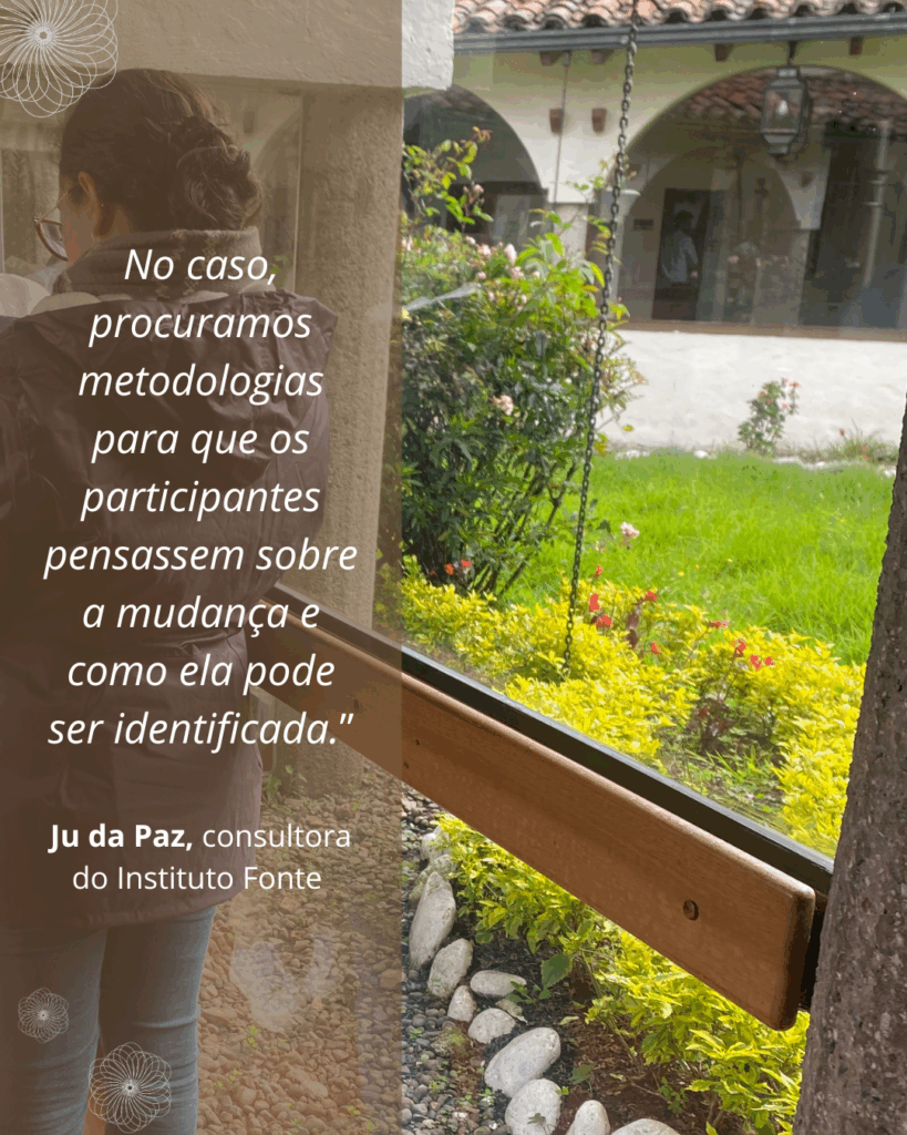 🌱 “Nossa proposta quis reforçar uma aprendizagem capaz de identificar o impacto provocado pelo projeto, assim como dialogar sobre os desafios da organização para expressar isso dentro dos relatórios. No caso, procuramos metodologias para que os participantes pensassem sobre a mudança e como ela pode ser identificada.” (Ju da Paz, consultora de facilitadora de processos)